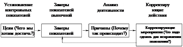 Во-первых, руководство должно заложить в годовой план контрольные показатели в разбивке по месяцам и (или) кварталам. Во-вторых, необходимо организовать замеры показателей рыночной деятельности фирмы. Для этого используются инструменты финансовой, бухгалтерской и управленческой отчетности компании. В-третьих, необходимо выявлять причины несоответствия плановых и реальных показателей деятельности. В-четвертых, руководство компании должно предпринимать меры по корректировке деятельности фирмы и ликвидации разрыва между поставленными целями и достигнутыми результатами.