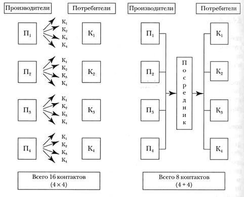 Количество необходимых контактов при наличии посредников в схеме, уменьшается вдвое, в результате чего снижаются издержки производителей и выигрывает потребитель.