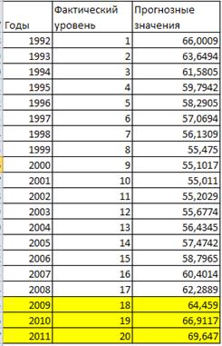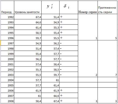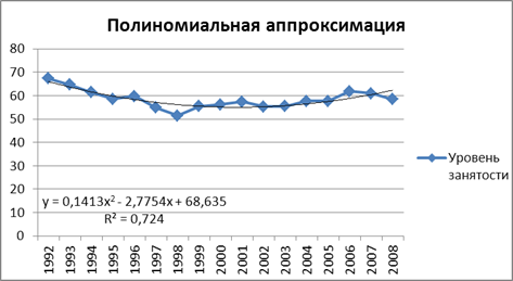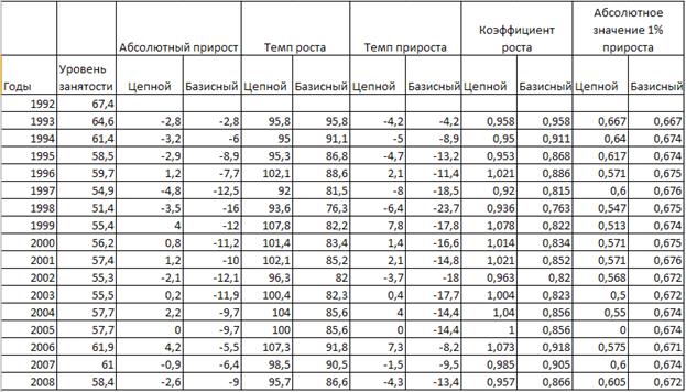 В ходе проделанной работы был произведен анализ занятости населения Оренбургской области. Были освещены сущность, виды, формы занятости, источники информации и статистические показатели занятости, а также методы анализа. Произведен экономико-статистический анализ занятости населения Оренбургской области. Рассмотрена структура занятости населения по уровню образования. Для анализа были взяты 2000 и 2008год. В итоге были прослежены структурные изменения в составе занятого населения по уровню образования. Далее был произведен анализ динамики уровня занятости. Были рассчитаны основные показатели: абсолютный прирост, темп роста, темп прироста, коэффициент роста, абсолютное значение 1% прироста. В практической части использовался также корреляционно-регрессионный анализ. В качестве результативного признака был взят уровень занятости населения Оренбургской области, в качестве факторов использовались «Уровень занятости населения», «Среднемесячная номинальной начисленной з/п работников», «Удельный вес населения в трудоспособном возрасте», «Численность ищущих работу граждан, не занятых трудовой деятельностью». Для выявления связи между признаками была построена матрица парных коэффициентов корреляции. После, коэффициенты были проверены на значимость. Далее провели регрессионный анализ. Уравнение регрессии показало, что при увеличении среднемесячной номинальной начисленной заработной платы работников на 1000 рублей, уровень занятости увеличится в среднем на 3,1%, при увеличении инвестиций в основной капитал на душу населения на 1000 рублей, уровень занятости увеличится в среднем на 0,5%, при увеличении численности ищущих работу граждан, не занятых трудовой деятельностью на 1 человека, уровень занятости снизился в среднем на 0,9%. Следующим этапом анализа было проведение кластерного анализа. Кластерный анализ проводился тремя методами: методом полных связей, методом Уорда и методом k-средних. В результате была выбрана наилучшая классификация полученная методом k-средних. На основе данной классификации вся совокупность разбивается на три класса: первый(г.Соль-Илецк, г.Гай, г.Ясный, г.Орск, г.Новотроицк, г.Бузулук, г.Бугуруслан, Первомайский, Оренбургский) наиболее активный и развитый с точки зрения рынка труда, второй(г.Сорочинск, г.Кувандык, , г.Абдулино, г.Медногорск, Новоорский, Тоцкий, Ясненский, Домбаровский, Светлинский, Сакмарский, Грачевский, Курманаевский, Гайский,Октябрьский, Красногвардейский) менее развит и третий(Ташлинский, Соль-Илецкий, Кувандыкский, Кваркенский, Асекеевский, Переволоцкий, Илекский, Беляевский, Александровский, Акбулакский, Бузулукский, Сорочинский, Новосергиевский, Саракташский, Шарлыкский, Тюльганский, Матвеевский, Пономаревский, Северный, Бугурусланский, Абдулинский, Адамовский) отсталый в своем развитии. На последнем этапе анализа провели прогнозирование уровня занятости Оренбургской области. Перед тем как построить тренд осуществили проверку на наличие тенденции. По полученным результатам в исследуемой совокупности имеется тенденция, следовательно, возможно построение тренда. По наибольшему коэффициенту детерминации и наименьшей ошибке аппроксимации наилучшим оказался полиномиальный тренд. По нему и строился прогноз. В итоге получили, что в 2009 году уровень занятости будет состав