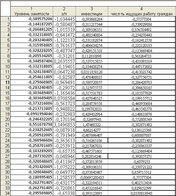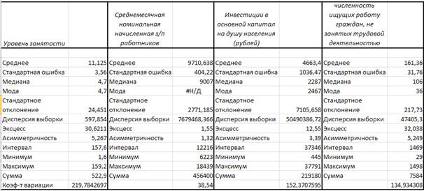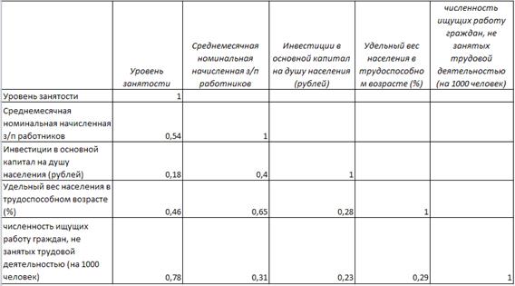 | Уровень занятости | Среднемесячная номинальная начисленная з/п работников, руб. | Инвестиции в основной капитал на душу населения (рублей) | Удельный вес населения в трудоспособном возрасте (%) | Численность ищущих работу граждан, не занятых трудовой деятельностью (на 1000 человек) | |