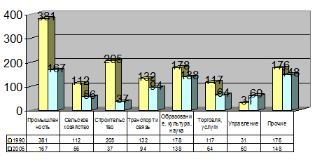 Занятость населения. Отмечается у худшение показателей занятости. В 2006 году по сравнению с 1990 годом занятость (число рабочих мест) в экономике области сократилась на 568 тыс. человек. При этом в производственном секторе экономики занятость сократилась на 476 тыс. человек, а в непроизводственном – на 64 тыс. человек. В производственном секторе наибольшее падение произошло в промышленности – 214 тыс. человек, в строительстве – 168 тыс. человек. [2:31]