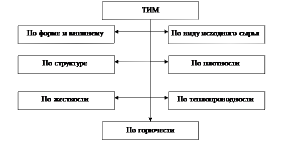 Теплоизоляционные материалы классифицируют по структуре, форме, внешнему виду, виду исходного сырья, средней плотности, жесткости (сжимаемости или остаточной деформации сжатия), теплопроводности, возгораемости ( ГОСТ 16381-77). Общая классификация ТИМ представлена в виде схемы (Приложение ).