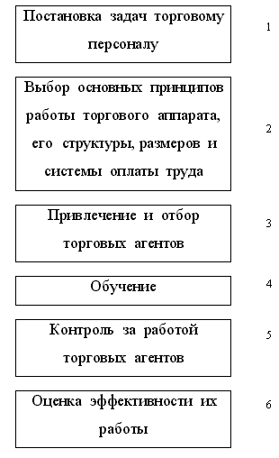 Эффективность личных продаж определяется в значительной степени продавцом. Поэтому фирмы тратят много времени, усилий и средств на организацию управления торговым аппаратом фирмы. Основные решения, которые фирме необходимо для этого принять, представлены на схеме, разработанной Ф. Котлером.