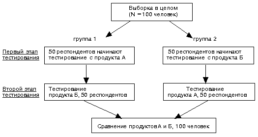 В ходе последовательного тестирования могут тестироваться два или более продуктов. Суть этого подхода заключается в том, что выборка делится на равные части – например, для двух продуктов на две равные части (см. рисунок 1). Каждая из подгрупп выборки одновременно начинает тестирование разных продуктов по одной и той же методике. На втором этапе тестирования происходит смена тестируемого продукта для каждой из подгрупп выборки. Например, группа 1 на втором этапе тестирует продукт Б, а группа 2 тестирует продукт А. Завершающий этап исследования – это сравнение двух продуктов между собой, а в анкете фиксируются общие предпочтения и причины предпочтений.
