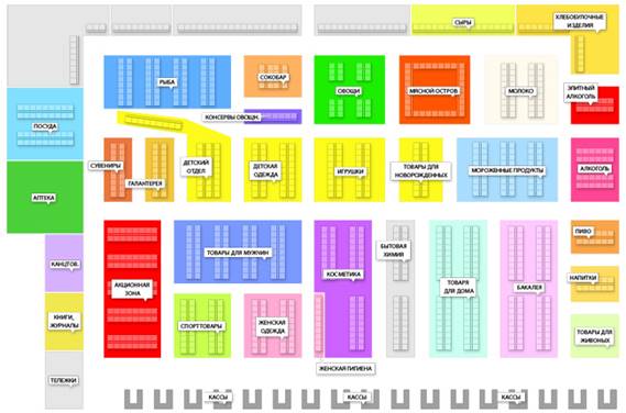 Формирование ассортимента товаров в гипермаркете имеет свою специфику и зависит от ряда факторов. На построение ассортимента оказывают влияние следующие факторы: размер магазина, его техническая оснащенность; условия товароснабжения, наличие постоянных поставщиков; численность обслуживаемого населения.