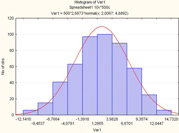 Для того чтобы сформулировать гипотезу о виде распределения, необходимо использовать априорную информацию. В нашем случае, дана выборка из неизвестной генеральной совокупности, физическое происхождение ни выборки, ни генеральной совокупности неизвестно. Следовательно, чтобы предположить вид распределения, необходимо построить гистограмму по полученным значениям выборки. Для получения наиболее четкой картины предполагаемого распределения возьмем выборку n=500 (Приложение А) и выполним построение гистограммы с помощью программы STATISTICA с количеством интервалов равным 10.