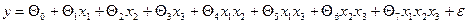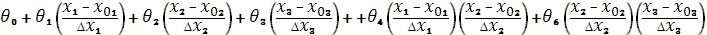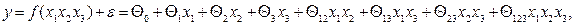 y = -1,31 + 1,92·x1 + 2,15·x2 + 14,61·x3 + 2,57·x1 ·x2 - 3,88·x2 ·x3 .