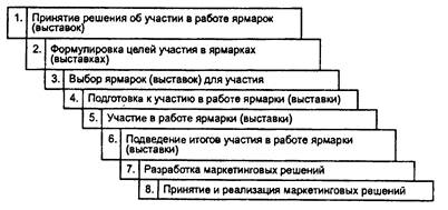 Исследователь маркетинговых коммуникаций И.Л.Акулич считает, что подготовку и участие в работе ярмарок и выставок можно представить как некоторый процесс, содержащий восемь основных этапов (Рисунок 2.1), на каждом из которых принимаются и реализуются соответствующие управленческие решения [1, с.342].