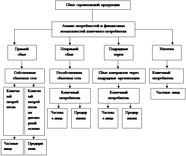Сфера строительных услуг не является исключением, поэтому и сбыт строительной продукции немаловажен для строительных организаций, хотя и до недавнего времени у строительных фирм не было потребности в организации отделов сбыта, так как ощущался дефицит в строительстве. Но сейчас ситуация изменилась и сбытовая политика в этой области имеет особое значение в связи со спецификой строительной продукции и строительных услуг. Здесь не применимы те методы и каналы сбыта, которые используются при реализации потребительских товаров.