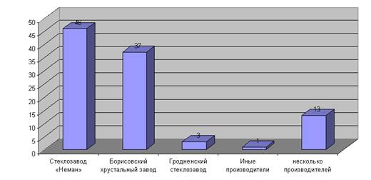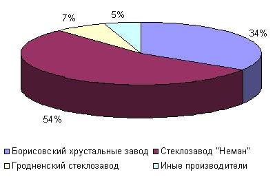 4. При анализе проводимых маркетинговых исследований на ОАО «Стеклозавод «Неман» было выявлено, что основным конкурентом является Борисовский хрустальный завод, с занимаемой долей рынка примерно 34%. Основная услуга предприятия – предоставление информации о новинках и возможность заказа товаров через Интернет, что существенно отличает Борисовский хрустальный завод от Стеклозавода «Неман».