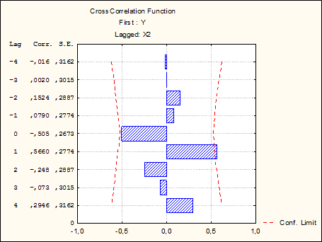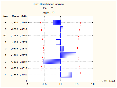 Вывод: При лаге, равном 1, коэффициент перекрестной корреляции значим и равен 0,5660.