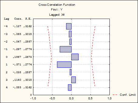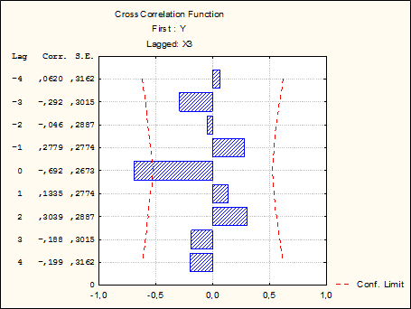 Вывод: При лаге, равном 0, коэффициент перекрестной корреляции значим и равен -0,692.