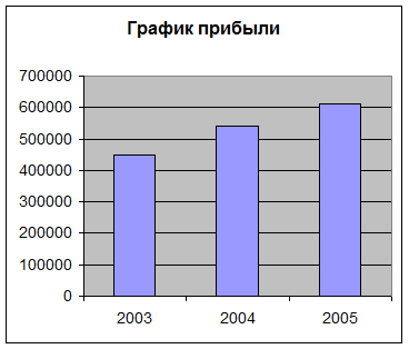 Из построенного графика можно сделать вывод, что прибыль с каждым годом возрастает. С 2003 по 2004 планируется увеличение прибыли на 91322 руб., а с 2004 по 2005 – на 71938. Очевидно, что избранный курс верен.