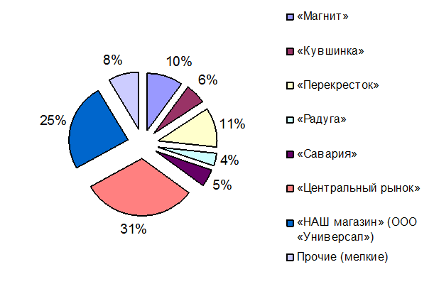 Основным рынком сбыта является г. Йошкар-Ола и п. Медведево. За короткий срок своего пребывания на рынке ООО "Универсал" успело завоевать долю рынка розничной торговли продовольственными товарами в 25%.