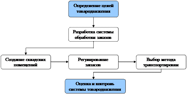 Товародвижение в целом включает следующие элементы: обработка заказов, транспортировка, получение, обработка и упаковка товаров, поддержание запасов, складирование, обслуживание сопутствующих информационных потоков, распределение и сбыт продукции. При этом, обеспечение комплексного управления всеми этапами для достижения общих целей деятельности предприятия строится на основании подхода, согласно которому все элементы деятельности предприятия представляют собой движение материальных, информационных и финансовых потоков по спроектированным каналам распределения.