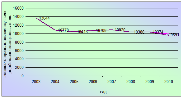 К началу 2010 г. исследованиями и разработками в Российской Федерации было занято 801,1 тысяч человек, что соответствовало около 1,2% общей численности населения занятого в экономике. Таким образом, в настоящее время в российской науке осталось только 41,2% кадрового потенциала, которым она располагала к началу 1990-х годов [3].