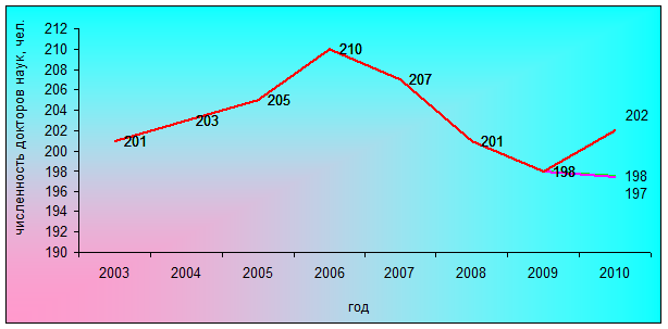 Если тенденция сохранится на уровне среднего абсолютного прироста, то в 2010 году численность докторов наук составит 198 человек. Если же тенденция сохранится на уровне темпа роста, то в 2010 году численность докторов наук будет приравниваться к 197 чел. А в соответствии с уравнением прямой в 2010 году численность докторов наук составит 204 человека.