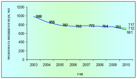 Такая динамика численности кандидатов объясняется тем, что молодые ученые после защиты кандидатской диссертации (средний возраст лиц, защитивших кандидатскую диссертацию и утвержденных ВАКом – 34 года) из-за отсутствия перспектив материального и карьерного роста вынуждены переходить на работу в другие сферы экономической деятельности, а некоторые продолжают научно-исследовательскую деятельность за рубежом [4].