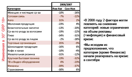 Сентябрь дал старт снижению рекламных бюджетов на ТВ для наиболее уязвимых категорий: финансы, торговля, бытовая техника и электроника, автомобили.