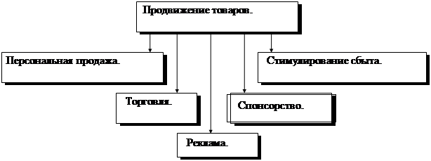 Продвижение товара является неотъемлемой частью маркетинга. Формирование политики в области стимулирования сбыта, продвижение товара; выбор, планирование и управление инструментами стимулирования сбыта (продажа по предварительным заказам, рекламно – информационная деятельность, искусство сбыта, упаковочное дело); рекламирование деятельности и определение задач рекламы; выбор средств передачи рекламы (телевидение, радио, печать и т.п.); установление контактов со средствами массовой информации, рекламными агентствами; разработка образцов, выставочных материалов; установление связей компании с отдельными лицами, общественными организациями, обмен информацией; упаковочное дело, разработка упаковки; мероприятия по сбыту товара; планирование и осуществление продвижения товаров (по продовольственным купонам и др.); разработка мер, направленных на увеличение продаж. [1, с. 48]