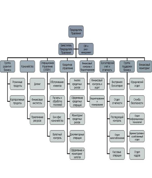 Структура предполагает деление банковской деятельности на отдельные части, представляющие собой до некоторой степени обособленные отрасли деятельности пли функции, осуществление которых служит достижению целей, стоящих перед банком. К таким сферам деятельности банков обычно относятся: управление банковскими операциями, маркетинг, бухгалтерский учет и отчетность, и хозяйственные управления. В зависимости от характера и объема задач, решаемых банком, могут создаваться дополнительные, более мелкие подразделения. Таковы классические требования к организационной структуре, которые легли в основу деятельности большинства организаций.