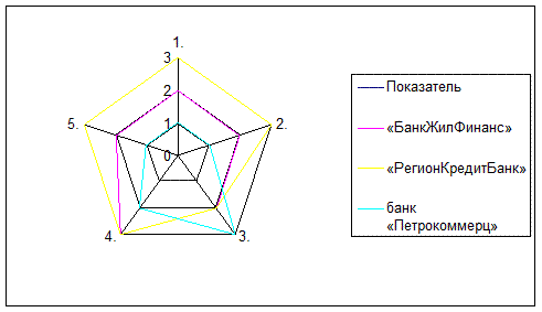 Вывод: На рисунке отчетливо видно, что «БанкЖилФинанс» уступает «РкгионКредиБанку» в качестве продукции и цене, Банку «Петрокоммерц» в рекламе, что важно. Именно в этих направления и нужно продвигаться ЗАО «БанкуЖилФинанс» для улучшения конкурентоспособности.