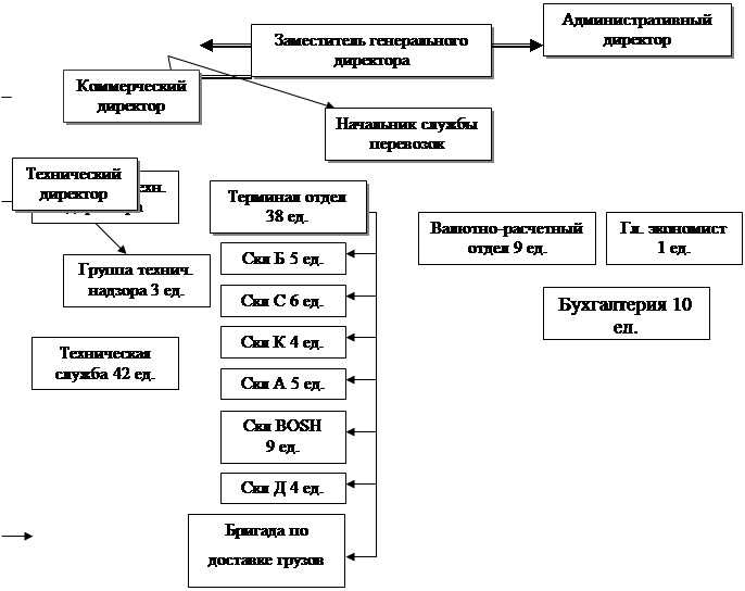 Основными структурными подразделениями предприятия являются служба логистики, служба перевозок, бухгалтерия, служба брокерского обслуживания, диспетчерско-информационный отдел, экспедиционный отдел, административный отдел, коммерческий отдел и отдел эксплуатации.