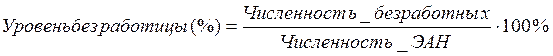 В соответствии с методикой Федеральной службы занятости России, подготовленной с учетом международных норм, показатель уровня безработицы определяется как отношение официально зарегистрированных в государственной службе занятости безработных к численности экономически активного населения, выраженное в %. Числитель при этом определяется службой занятости за определенный период (месяц, квартал, полугодие и год), знаменатель является показателем, который представляют органы Государственного комитета по статистике России.