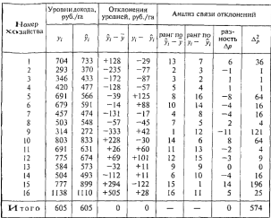 Пример. Рассмотрим расчет и анализ отклонений по ранее построенной модели уровня валового дохода в 16 хозяйствах. Знаки тех и других отклонений 8 раз совпадают и 8 раз не совпадают. Коэффициент корреляции рангов отклонений двух видов составил 0,156. Это означает, что связь вариации факторообеспеченности с вариацией фактороотдачи слабая, несущественная (табл. 9.12). Обратим внимание на хозяйство № 15 с высокой факторообеспеченностью (15-е место) и самой худшей фактороотдачей (1-й ранг), из-за которой хозяйство недополучило по 1 22 руб. дохода с 1 га. Напротив, хозяйство № 5 имеет факторообеспеченность ниже средней, но благодаря более эффективному использованию факторов получило на 125 руб.