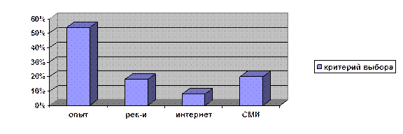 Исследование показало, что большинство опрошенных 27 (54%) при выборе стоматологической клиники руководствуются собственным опытом, 9 (18%) выбирают клинику по совету родственников, друзей, знакомых. Через интернет клинику выбирают 4 (8%) опрошенных. СМИ помогают в выборе 10 (20%) респондентов.