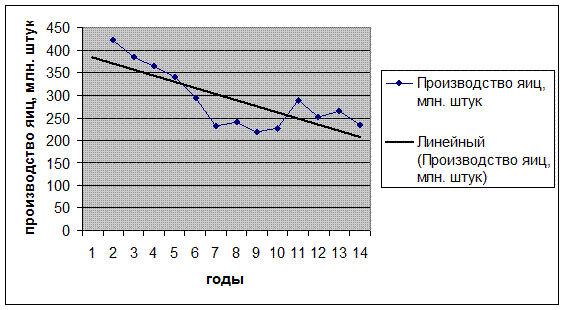 В данной курсовой работе был проведён экономико-статистический анализ динамики производства яиц в хозяйствах всех категорий Ивановской области за период с 1991 по 2003 гг. Проведённый анализ динамики производства яиц показал, что во всех хозяйствах области наблюдается существенная тенденция к снижению производства яиц. При этом среднее снижение производства яиц составляет в среднем 13,54 млн. штук.