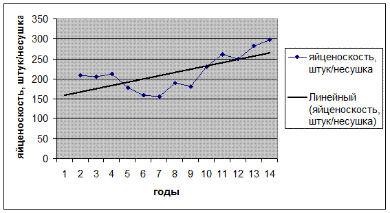 Проведённый анализ динамики яйценоскости кур - несушек показал, что во всех хозяйствах области наблюдается существенная тенденция к росту яйценоскости кур - несушек. При этом средний рост яйценоскости составляет в среднем 8 яиц на одну курицу – несушку. Не смотря на это, производство яиц в Ивановской области снижается, что, скорее всего, связано со снижением поголовья птицы в хозяйствах всех категорий Ивановской области.