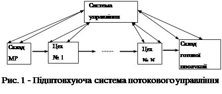 "Підштовхуюча система" - система організації виробництва, у якій предмети праці, що надходять на виробничу ділянку, безпосередньо цією ділянкою не замовляються. Матеріальний потік виштовхується одержувачу за командою із центральної системи управління виробництвом (рис.1).