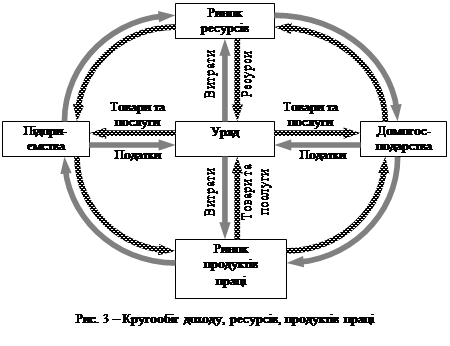 Разом з тим, навіть в умовах переважно ринкових систем економічні функції уряду відіграють істотну роль (змішана економіка) - всі реально функціонуючі макроекономічні системи - змішані. У змішаній економіці уряд повністю інтегрований у кругообіг матеріальних і товарних потоків і коштів, які утворюють економічний організм - рис.3 (за Р. Макконелом та С.Л. Брю).