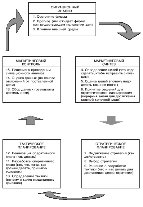 Будучи заключительной фазой одного цикла управления и одновременно исходным моментом нового управленческого цикла, контроль неразрывно связан с ситуационным анализом, особенно при ситуационном процессе управления, предполагающем корректирующие обратные связи. Организация маркетинговой деятельности фирмы по "кольцевому" принципу представлена на рисунке 2.