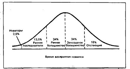 Специальный раздел посвящен особенностям покупательского поведения по отношению к товарам-новинкам. Автор знакомит читателей с индивидуальными различиями людей в готовности принять новшество (Котлер употребляет в этой ситуации слово «восприятие», толкуя его как «решение индивида стать регулярным пользователем товара»), деля всех потребителей на новаторов, ранних последователей, раннее большинство, запоздалое большинство и отстающих. Кроме того, успех новинки во многом зависит от таких характеристик самого товара, как сравнительное преимущество, совместимость, сложность, делимость процесса знакомства и коммуникативная наглядность. Думается, что подобная оценка нового товара может многое прояснить в поведении потенциальных покупателей.