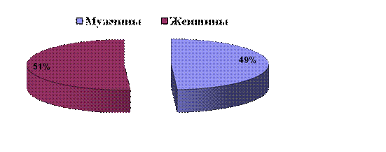 Как видно на рисунке женщины и мужчины распределились примерно одинаково.
