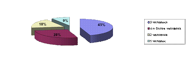 Как следует из рисунка 3.3., около половины респондентов (45%) проживают в семьях из трех человек. У более четверти опрошенных (28%) в состав семьи входит 4 и более человек. Среднее число членов семьи по всей выборке составляет 3 человека.