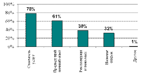Как следует из данной гистограммы, все четыре рассматриваемых фактора оказывают заметное влияние на потребителей в процессе выбора турагентства. При этом наибольшие доли опрошенных (78% и 61% соответственно) ориентируются, в первую очередь, на стоимость услуг агентства и предыдущий личный опыт. На втором месте по приоритетности находятся факторы: рекомендации знакомых (38%) и наличие скидок (32%).