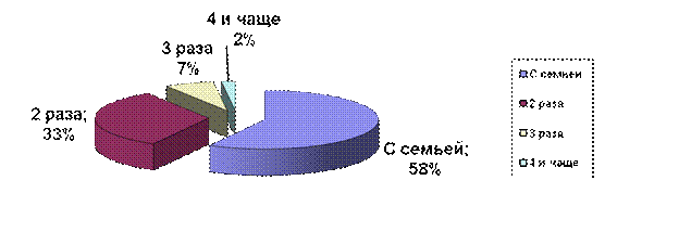 Как видно на рисунке 3.8., больше половины респондентов (58%) совершают туристские поездки довольно редко (1 раз в год). Еще часть опрошенных (33%) – 2 раза в год. Далее, с увеличением частоты поездок, доли респондентов продолжают убывать. Средневзвешенная частота совершения поездок – 1 раз в год.