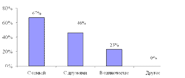 Из рисунка 3.9. следует, что 2/3 респондентов (67%) предпочитают путешествовать с семьей. Около половины опрошенных (46%) – совершают поездки в составе группы друзей, а 23% любят путешествовать в одиночестве.