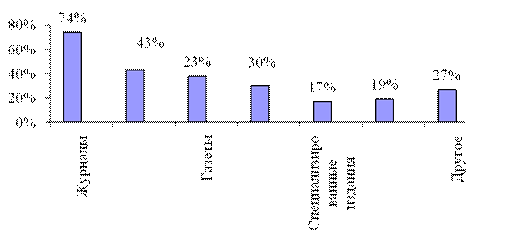 Большинство потребителей (74%) узнают о предложении турпродукта из журналов. На втором месте по популярности с большим отрывом находится наружная реклама (43%). «Сети магазинов горящих путевок» можно порекомендовать сделать акцент в своей рекламной компании именно на работе с данными СМИ. Затем следуют газеты и телевидение (38 и 30% соответственно). Остальные виды СМИ указали меньшие доли респондентов. Среди специализированных изданий, которые указали 17% опрошенных, наиболее популярны: «Туризм и отдых», «Чук и Гек», «Туризм» и «Вояж».
