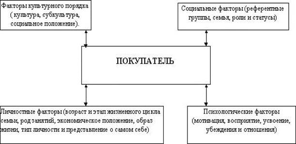 На поведение покупателя оказывают влияние четыре основных группы факторов: факторы культурного уровня (культура, субкультура и социальное положение), социальные факторы (референтные группы, семья, роли, статусы), факторы личного порядка (возраст, этап жизненного цикла семьи, род занятий, образ жизни, тип личности и представление о самом себе) и факторы психологического порядка (мотивация, восприятие, убеждение и отношение). Все они дают представление о том, как эффективно обслужить и охватить покупателя.