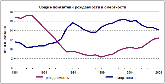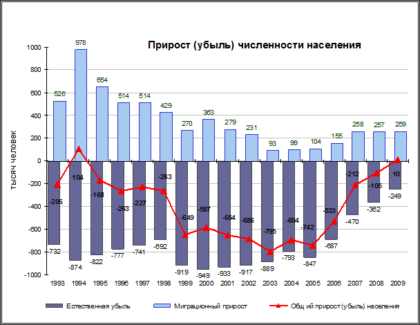 Снижению темпов депопуляции, а затем и некоторому росту численности населения в 2009 г. способствовало сокращение естественной убыли населения. В 2009 г. естественная убыль составила 249 тыс. человек, это наименьший показатель за последние 16 лет.