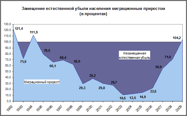 Вклад миграционного компонента в рост численности населения неуклонно уменьшался практически до 2003 года. Увеличение миграционного прироста в последующие годы при сокращении естественной убыли привели к замедлению темпов сокращения численности населения. В 2008 г. естественная убыль была на 71,0% замещена миграционным приростом (в 2007 г. – на 54,9%, в 2006 г. – на 22,5%). В 2009 г. сокращение естественной убыли стало определяющим компонентом роста численности населения страны.