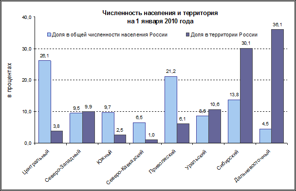 Изменения численности населения в 2009 г. практически не повлияли на структуру расселения. Более четверти (26%) россиян проживают в Центральном федеральном округе, где плотность населения наибольшая и составляет 57 человек на 1 кв. км. (в среднем по России плотность населения – 8,3 человека на 1 кв. км.). Почти также плотно заселен Северо-Кавказский федеральный округ, плотность населения которого 54 человека на 1 кв.км. Самыми малонаселенными к 1 января 2010 г. были Республика Саха (Якутия), Камчатский край, Магаданская область, Ненецкий, Чукотский и Ямало-Ненецкий автономные округа, где плотность населения составляла менее 1 человека на 1 кв. км.