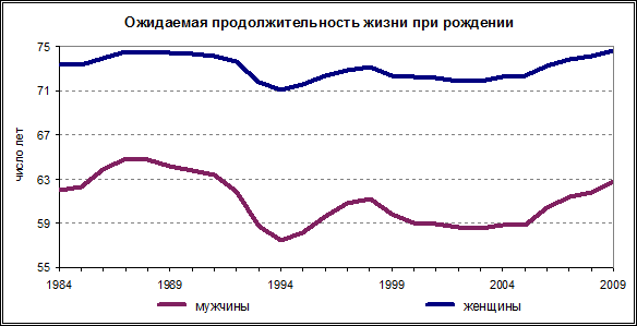 Наиболее высокими показатели ожидаемой продолжительности жизни сохраняются в республиках Северного Кавказа и г.Москве. В этих регионах показатель ожидаемой продолжительности жизни при рождении у мужчин в 2009 году превысил 69 лет, у женщин – 77 лет. Наиболее низкая продолжительность жизни и мужчин, и женщин отмечается в Республике Тыва и Чукотском автономном округе (у мужчин она не достигает 55 лет, у женщин – 66 лет).