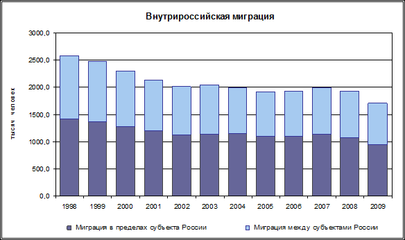 В 2001-2008 гг. передвижения внутри страны практически стабилизировались на уровне 1,9 - 2 млн. человек. Однако в 2009 г. число мигрантов, сменивших место жительства в пределах страны, сократилось по сравнению с 2008 г. на 227 тысяч человек, или на 12% и составило 1,7 млн. человек. В 2008 г. во внутренних миграциях участвовало на 63,6 тыс. человек (на 3,2%) меньше, чем в 2007 г. (в 2007 г. – на 62,3 тыс. человек или на 3,2% больше, чем в 2006 г.).