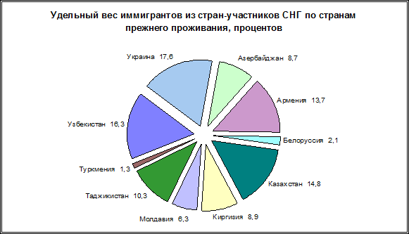 Среди всех иммигрантов в 2009 г. около 93% (261,5 тыс. человек) составляли бывшие жители стран-участников СНГ, из них почти половина - выходцы из Украины, Узбекистана и Казахстана (соответственно 45,9 тыс.человек, 42,5 тыс. и 38,8 тыс. человек).