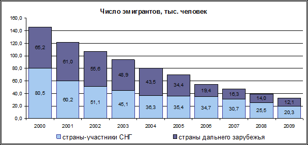 Учтенная эмиграция на протяжении двух десятилетий ежегодно уменьшается. При этом ее структура по странам предполагаемого проживания существенно меняется. В начале 1990-х годов число выбывших в страны – участники СНГ превышало число выбывших в страны дальнего зарубежья в 3-5 раз, в 2001-2005 гг. их численность была практически одинаковой, начиная с 2006 г. эмигрантов в страны СНГ в 2 раза больше, чем в другие зарубежные страны.